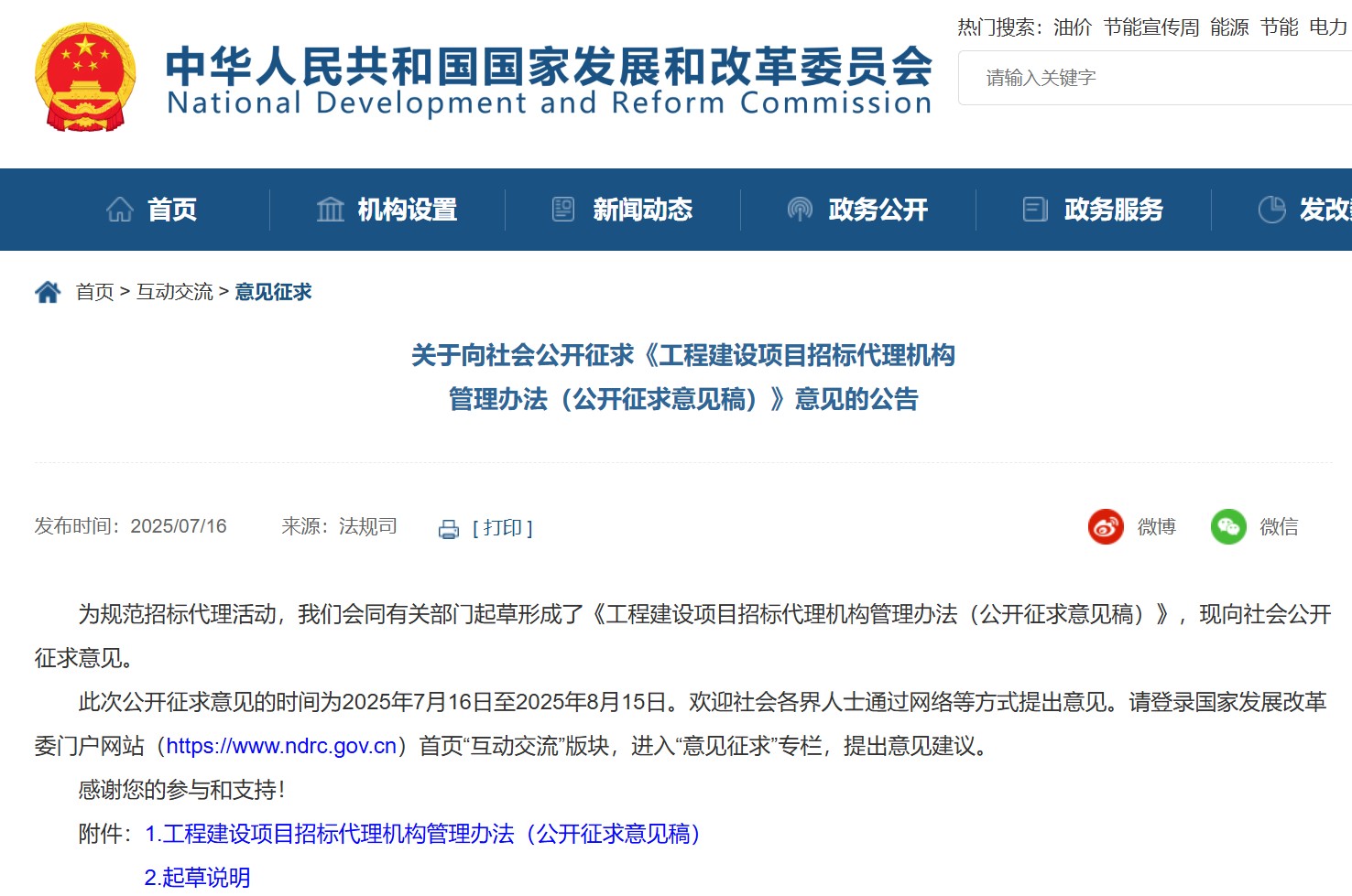國家發(fā)展和改革委員會向社會公開征求《工程建設(shè)項(xiàng)目招標(biāo)代理機(jī)構(gòu)管理辦法(公開征求意見稿)》意見